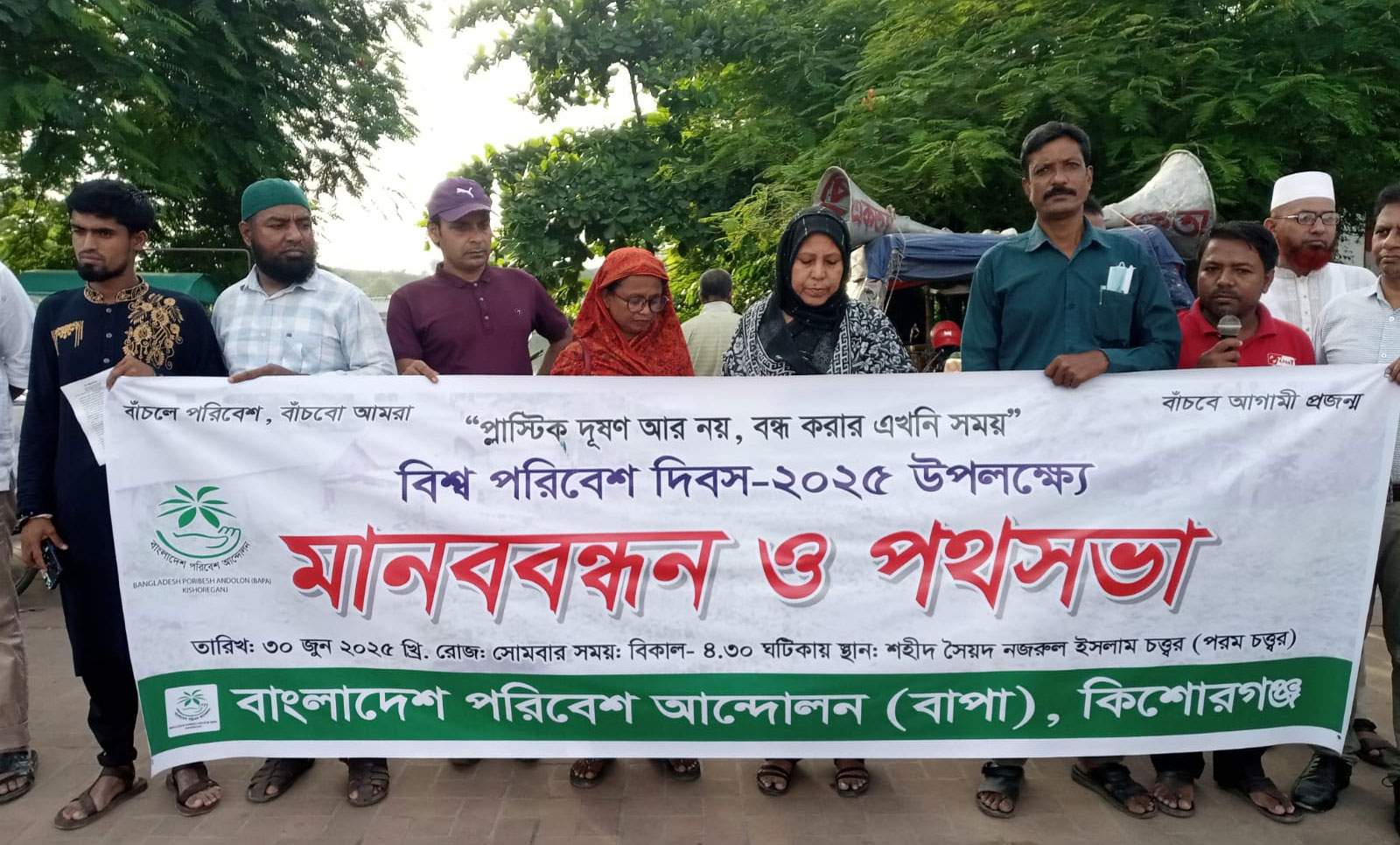 বিশ্ব পরিবেশ দিবস ২০২৫ উপলক্ষে "প্লাস্টিক দূষণ আর নয়, বন্ধ করার এখনই সময়" প্রতিপাদ্যকে সামনে রেখে মানববন্ধন ও পথসভা করেছে বাংলাদেশ পরিবেশ আন্দোলন (বাপা) কিশোরগঞ্জ জেলা শাখা। সোমবার (৩০ জুন)…