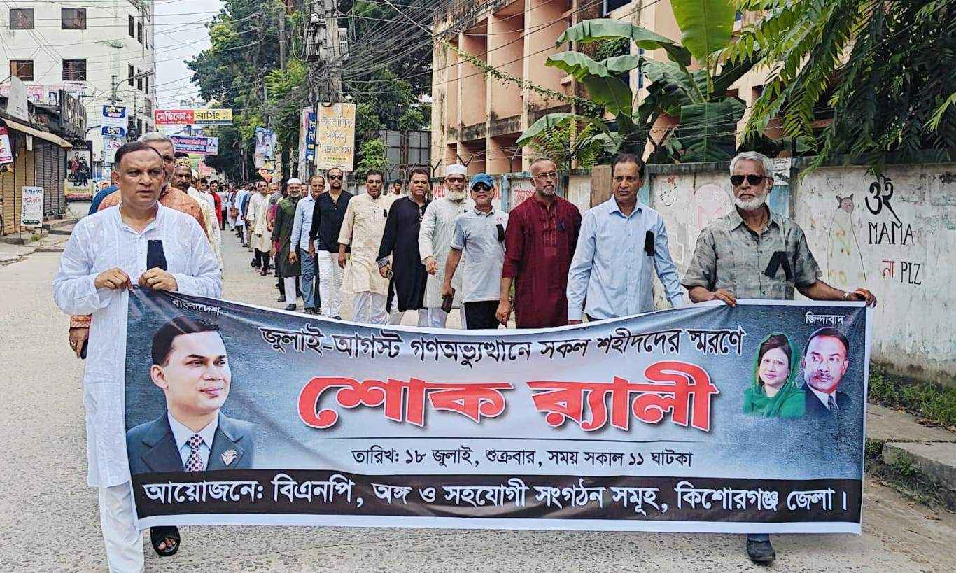 জুলাই-আগস্টের ঐতিহাসিক গণঅভ্যুত্থানে শহীদদের স্মরণে কিশোরগঞ্জে শোক র্যালি ও সংক্ষিপ্ত সমাবেশ অনুষ্ঠিত হয়েছে। শুক্রবার (১৮ জুলাই) দুপুরে জেলা বিএনপি ও অঙ্গ-সহযোগী সংগঠনের উদ্যোগে এ শোক র্যালি কর্মসূচি পালন করা হয়।