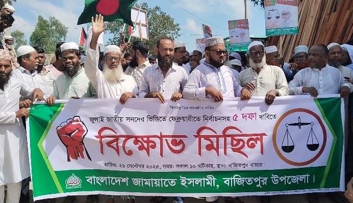 কিশোরগঞ্জের বাজিতপুরে বাংলাদেশ জামায়াতে ইসলামীসহ বিভিন্ন ইসলামী দল জুলাই সনদ বাস্তবায়ন ও আগামী জাতীয় সংসদ নির্বাচনে পিআর পদ্ধতি চালুসহ পাঁচ দফা দাবিতে বিক্ষোভ সমাবেশ করেছে।