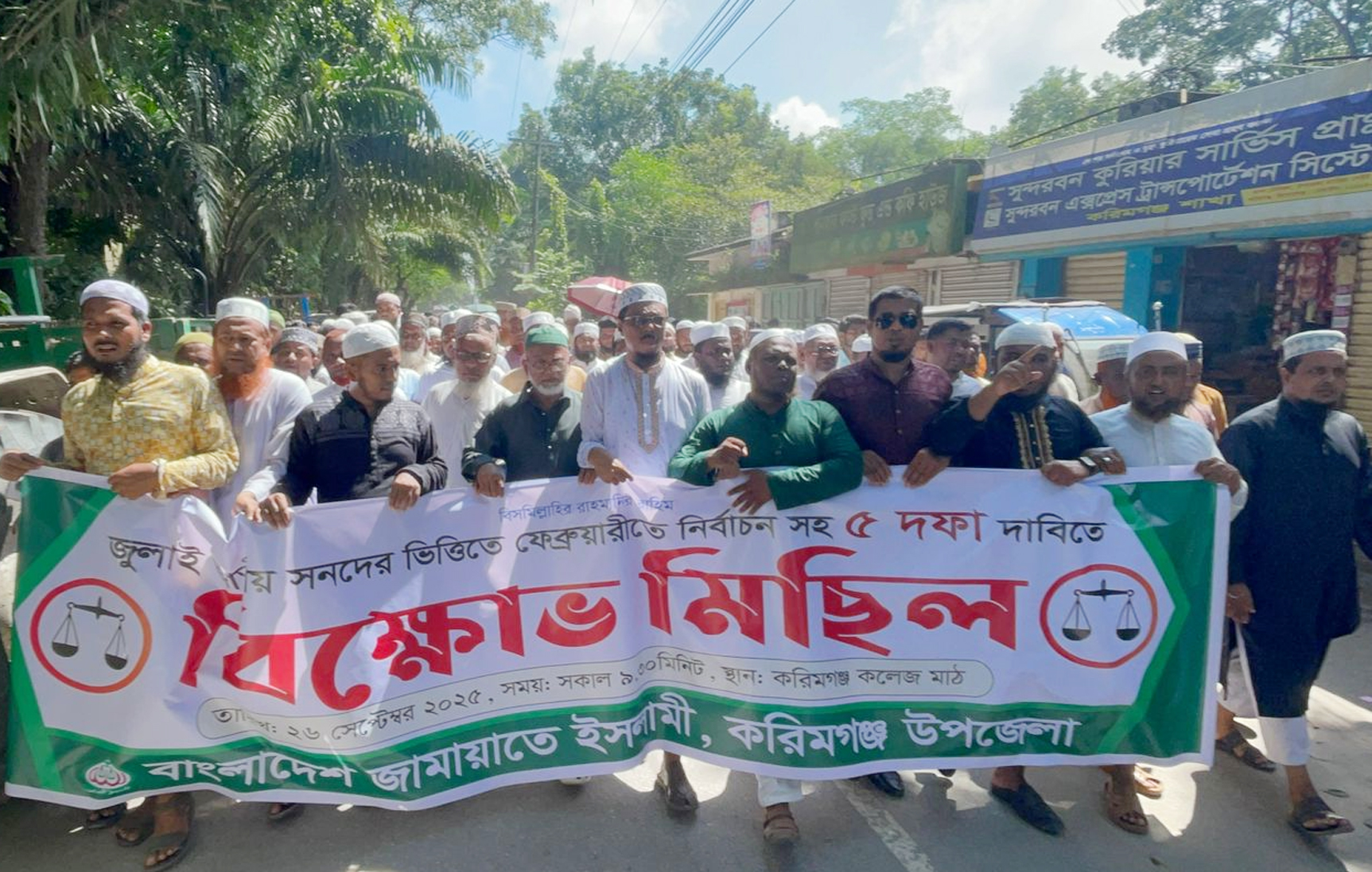 কিশোরগঞ্জের করিমগঞ্জে পাঁচ দফা দাবিতে বিক্ষোভ মিছিল করেছে বাংলাদেশ জামায়াতে ইসলামী। শুক্রবার (২৬ সেপ্টেম্বর) সকাল ১০টায় উপজেলা জামায়াতের আয়োজনে উপজেলা সদরে এই বিক্ষোভ মিছিল অনুষ্ঠিত হয়।