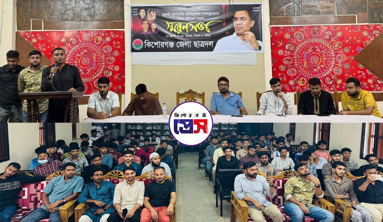 ঐতিহাসিক জুলাই-আগস্ট গণঅভ্যুত্থানে শহীদ আবু সাঈদ, শহীদ ওয়াসিম আকরামসহ সকল বীর শহীদদের স্মরণে কিশোরগঞ্জে স্মরণসভা অনুষ্ঠিত হয়েছে। বুধবার (১৬ জুলাই ২০২৫) কিশোরগঞ্জ জেলা ছাত্রদলের উদ্যোগে জেলা পাবলিক লাইব্রেরি মিলনায়তনে এই স্মরণসভা আয়োজন করা হয়।