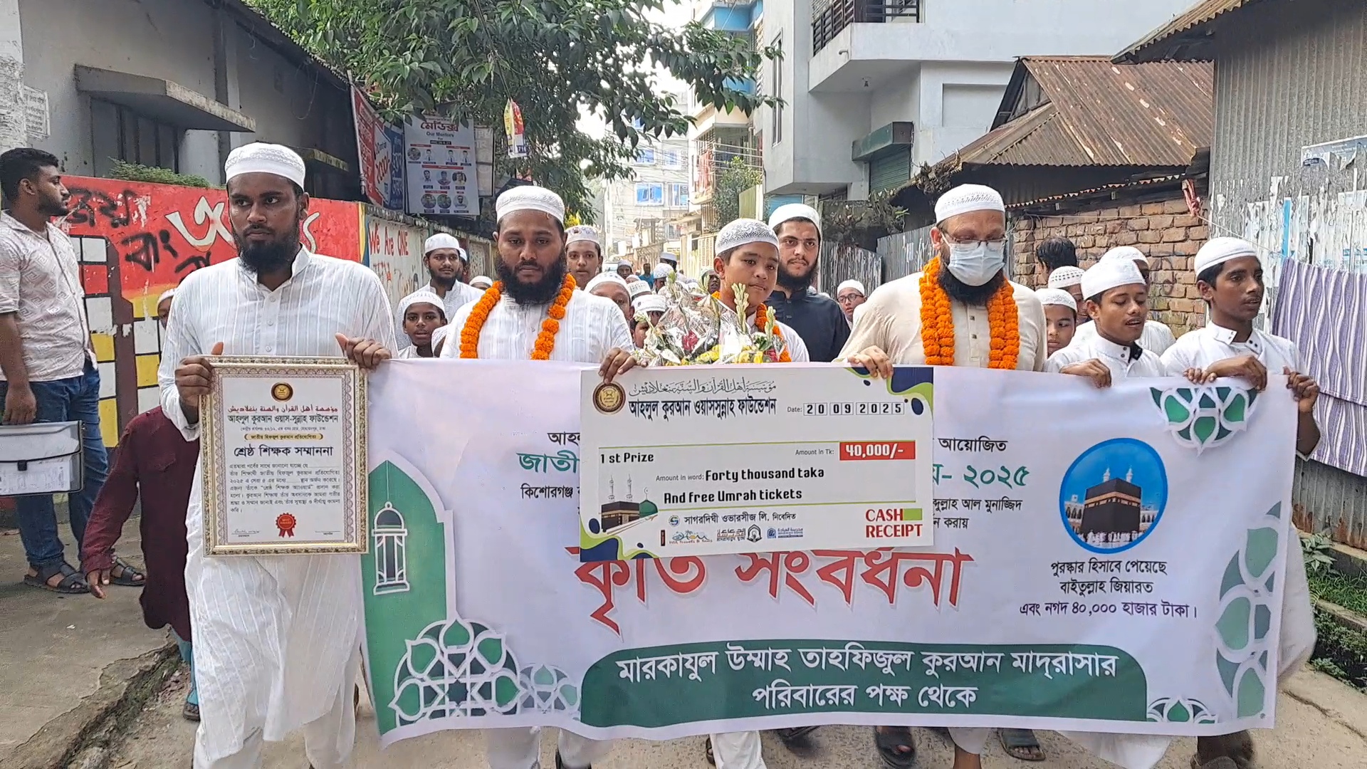 আহলুল কুরআন ওয়াসসুন্নাহ ফাউন্ডেশন বাংলাদেশ আয়োজিত জাতীয় হিফজুল কুরআন প্রতিযোগিতা–২০২৫-এ প্রথম স্থান অর্জন করে কিশোরগঞ্জকে গৌরবে ভাসিয়েছে ১৩ বছরের মেধাবী হাফেজ মো. আব্দুল্লাহ আল মুনাজ্জিদ।